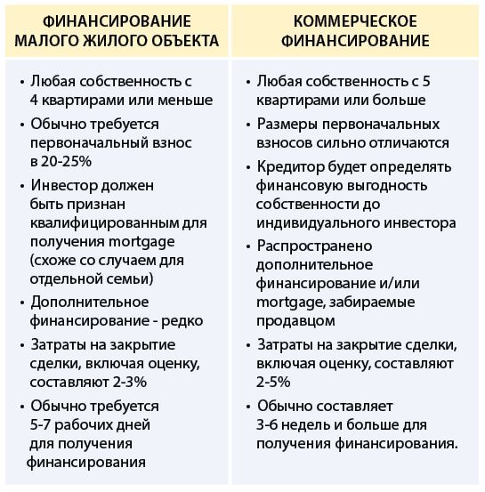 Процесс финансирования в жилой объект обычно намного проще и быстрее по сравнению с коммерческим. Вы также можете рассчитывать на банк или кредитора, которые запросят 20-25% предоплаты и квалифицируют ваш личный долг, так же как в случае с обычным домом на одну семью. Кредиторы точно примут во внимание доход, затраты и поток денег, которые приносит собственность. При этом у каждого кредитора свои правила относительно того, как эти цифры пропорционально связаны.