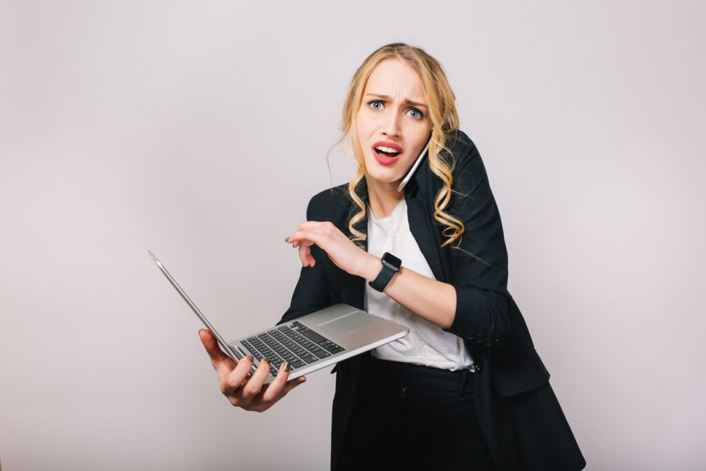 Portrait modern pretty blonde office woman in white shirt and black jacket working with laptop, talking on phone on white background. Astonished, being late, upset, meetings, expressing true emotions