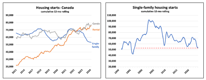 Да, это немного остудит арендный рынок, но это всего лишь означает, что мы перейдём от 10% годового роста при смене арендаторов к чему-то около 2-3%. И да, это может немного повлиять на спрос на кондо, где инвесторы обычно преобладают. Последние данные о начале строительства жилья показывают, что число новых домов упало до уровней, последний раз наблюдавшихся в 1990-х годах, и, вероятно, продолжит снижаться, судя по данным о разрешениях на строительство.