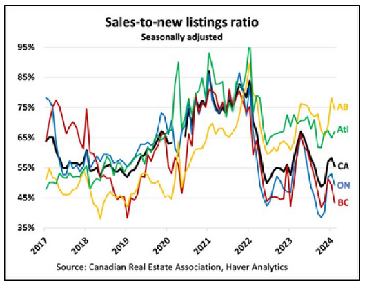 Состояние рынка ухудшилась в прошлом месяце во всех регионах, кроме Атлантических провинций. Особенно примечательным стало снижение соотношения продаж к новым листингам в Британской Колумбии, которое упало обратно до 44%, что явно указывает на рынок покупателя.