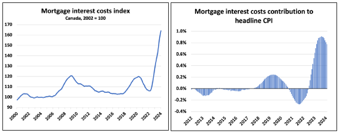 Расходы на ипотечные проценты по-прежнему добавляют 0.8% к индексу потребительских цен Насколько мне известно, в большинстве стран процентные ставки исключаются из потребительских корзин, чтобы избежать ситуации, когда “собака гонится за собственным хвостом” из-за действий центрального банка. Но не в Канаде, где индекс затрат на ипотечные проценты продолжает расти и теперь составляет 80 базисных пунктов или 0,8% от общего индекса потребительских цен.