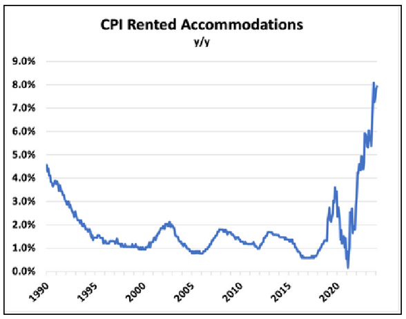 Арендная плата по-прежнему стремительно растёт. Арендная плата продолжает оставаться болезненной темой для Банка Канады. Индекс арендного жилья вырос на 7.9% в годовом исчислении и добавляет более 50 базисных пунктов к индексу потребительских цен.