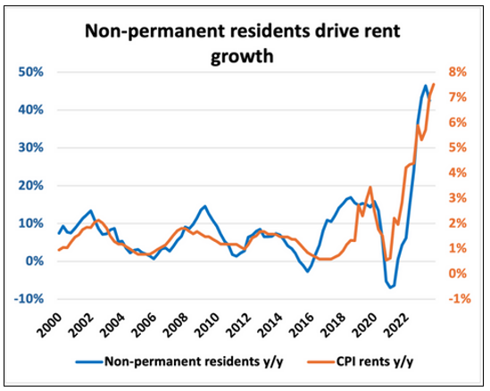 Я должен прояснить кое-что, связанное со специальным отчётом на этой неделе. ЕСЛИ федеральное правительство выполнит обещанное и ЕСЛИ сокращение численности временных резидентов будет более или менее линейным, то через год мы увидим рост населения примерно на 300,000 человек в год. Это резкое сокращение с нынешних 1,2 млн, но давайте вспомним, что это не так уж далеко от среднегодового темпа роста с 2010 по 2016 год.