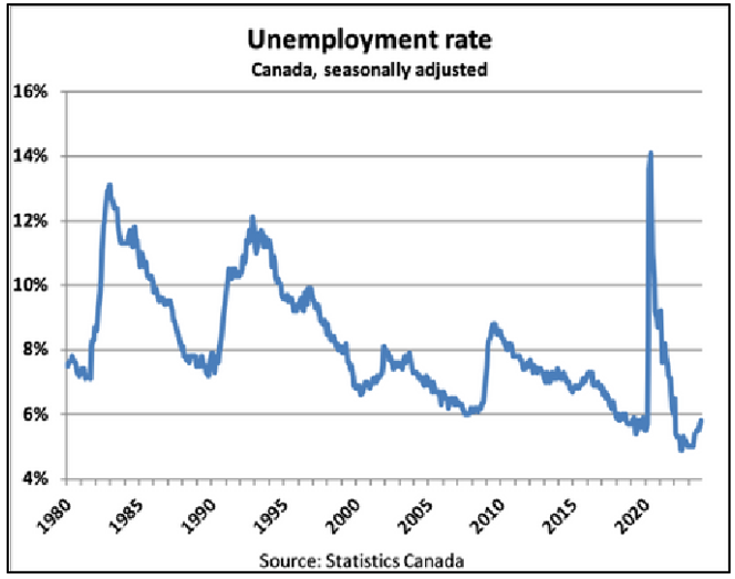Это подводит нас к правилу Самма, которое гласит, что исторически рецессия в США наиболее вероятна, когда средний трехмесячный уровень безработицы поднимается на 50 пунктов выше 12-месячного минимума. Клаудия Сам, создательница одноимённого правила, в 2021 году написала в блоге сообщение, в котором предположила, что пороговый уровень в Канаде ближе к 60 базисным пунктам, при этом единственный ложный показатель рецессии произошёл в 1961 году. По моим подсчётам, сейчас мы почти на 70 базисных пунктов выше 12-месячного минимума. (см. рис. 4)