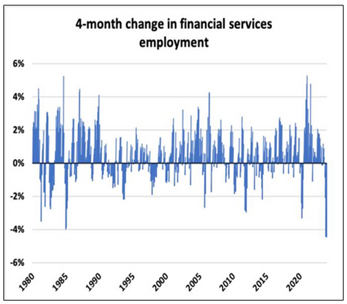 3) Третья проблема, вызывающая беспокойство, связана с лидирующей отраслью финансовых услуг, которая, по своей сути, опирается на внутреннюю экономику. Мы видим, что численность персонала в секторе сокращается уже четыре месяца подряд и в целом на 4,4%.