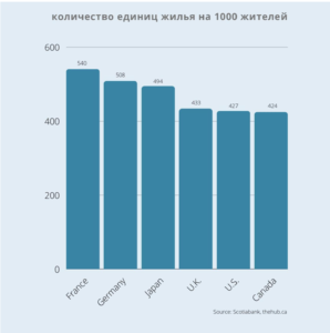 Согласно исследованию Scotiabank, среди стран Большой Семерки Канада имеет самое низкое количество жилищных единиц на 1000 жителей. Другими словами, нынешнее количество жилищных помещений не удовлетворяет спрос на жилье в Канаде. На графике ниже отчетливо видна разница по единицам жилья на 1000 человек в разных странах.