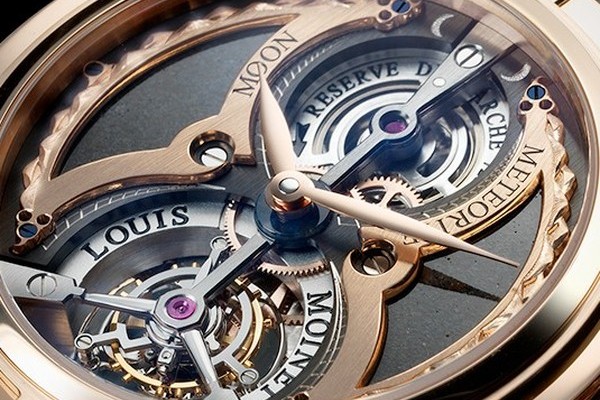 В часах же марки Louis Moinet настоящие осколки Луны. Такой изюминки нет больше ни в одном механизме мира. 2000-летний метеорит показывает лунные фазы, и закован в очень сложном механизме Magistralis со столетней историей. Корпус сделан из розового золота и составлен из 90 разных частей.
